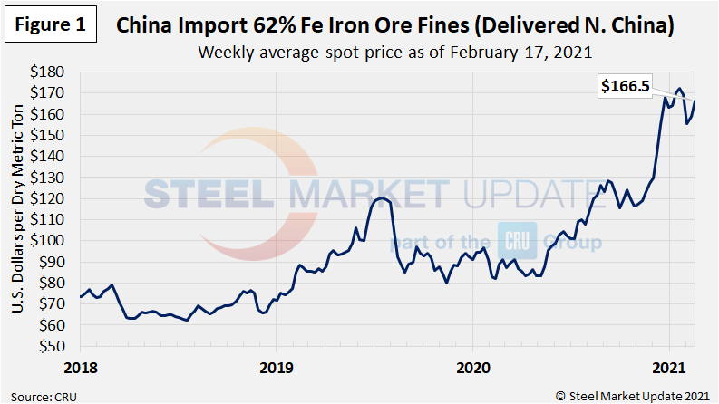 The Chinese import price of 62% Fe content iron ore fines has been on the rise since May 2020. Figure 1 shows the price of 62% Fe delivered North China at $166.5/dmt as of Feb. 17, down slightly from January figures, but up significantly over recent years. (Editor’s note: Subsequent to this writing, SMU’s sister company CRU reported an increase in Chinese iron ore prices, up to $174.0 /dmt, due to the Chinese New Year holidays ending and optimism regarding steel demand.)