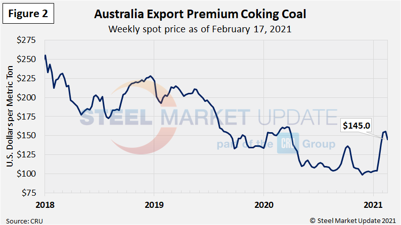 The price of premium low volatile coking coal FOB east coast of Australia declined throughout much of 2020, reaching a low of $98.5 in late-November. Prices bounced upwards since then, reaching a 10-month high in early February and currently at $145.0 dollars per dry metric ton as of Feb. 17 (Figure 2). More recent CRU data shows prices declined this week to around $137/dmt, with prices expected to remain stable over the week ahead. Recent coking coal prices remain low compared to years prior.
