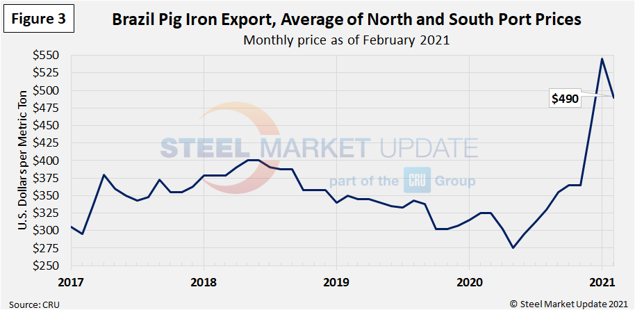 Most of the pig iron imported to the U.S. currently comes from Russia, Ukraine and Brazil. This report summarizes prices out of Brazil and averages the FOB value from the north and south ports. The latest data through February shows an average pig iron price of $490 per metric ton, down 10% over the previous month, but up 34.2% from three months prior and up over 50% from levels one year ago. Pig iron prices had declined since mid-2018, but increased each month from June 2020 through January 2021 (Figure 3).