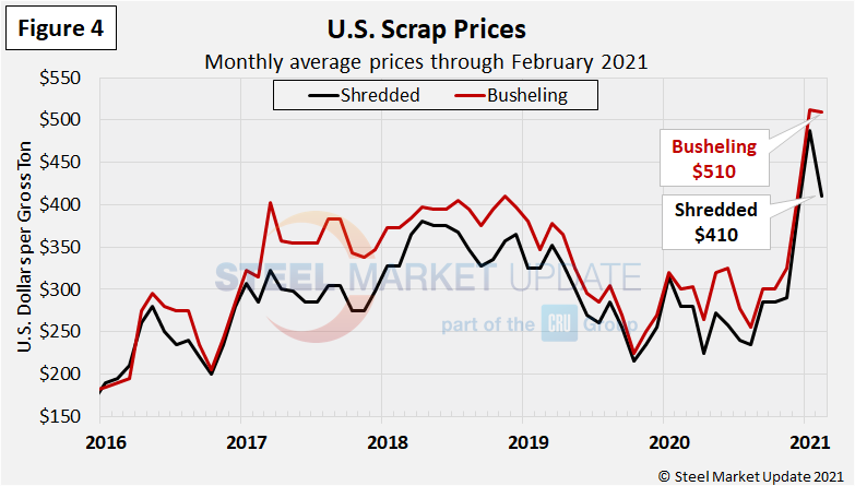 Hot rolled steel prices fluctuate up and down with the price the mills must pay for their raw materials. Changes in the relationship between scrap and iron ore prices offer insights into the competitiveness of integrated mills, whose primary feedstock is iron ore, versus the minimills, whose primary feedstock is scrap. Figure 4 shows the spread between shredded and busheling, both priced in dollars per gross ton in the Great Lakes region. February scrap prices were flat to down 16% from January, but up between 46-70% compared to this time last year. Scrap prices are expected to level off or decline somewhat in March.
