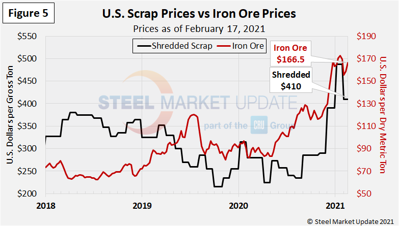 Figure 5 shows the recent spread between the price of iron ore, at $166.5 per dry metric ton, and shredded scrap at $410 per gross ton.