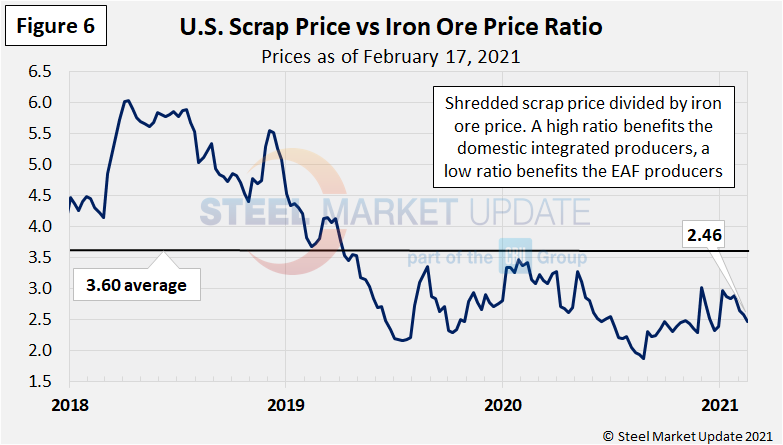 To compare the two, Steel Market Update divides the shredded scrap price by the iron ore price to calculate a ratio (Figure 6). A high ratio favors the integrated/BF producers, a lower ratio favors the minimill/EAF producers. At the current 2.46 ratio shown below, minimills continue to hold a more competitive cost advantage. This ratio hit an all-time low of 1.86 in August 2020 (within SMU’s 12-year limited data history).