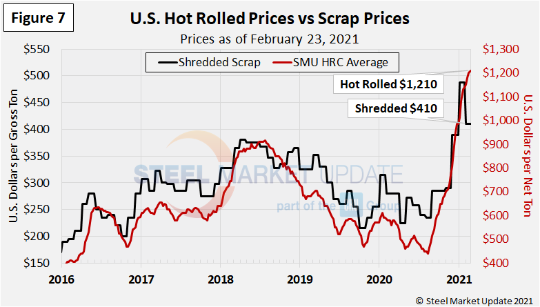 Figure 7 shows how the price of hot rolled steel generally tracks with the price of shredded scrap. Shred fell by approximately $80 from January to February, while hot rolled prices have risen $200 since the start of the year; the SMU hot rolled average was $1,010 in the first week of January and reached $1,210 as of Feb. 23.