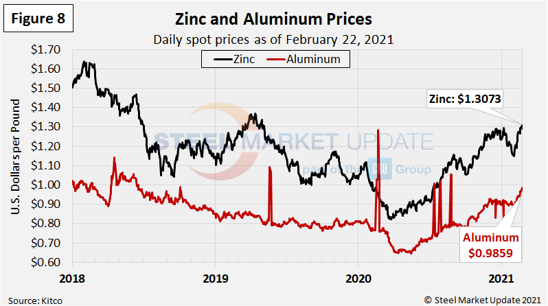 Zinc, used to make galvanized and other products, has steadily risen since March 2020, reaching a 21-month high this week (Figure 8). The LME cash price per pound of zinc as of Feb. 22 was $1.3073, up 57 percent from the March 2020 low of $0.8236. The price of zinc factors into the coating extras charged by the mills for galvanized products. Many mills revised their coating extras upwards in December to reflect the higher zinc price. Aluminum prices, which factor into the price of Galvalume, have been trending upwards over the last few months and are at a multi-year high. Note that aluminum prices often have large swings and return to typical levels within a few days, as seen in the graphic below. The LME cash price per pound of aluminum was $0.9859 as of Feb. 22, and has been hovering around $0.90 since late-November 2020.