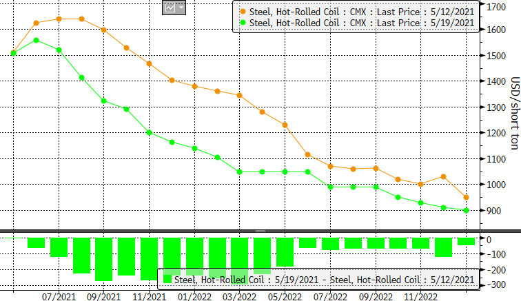 Throughout this price rally, buyers have kept a keen eye out for data or events that will signal a long-awaited correction. Last week, with the European Union’s suspension of a scheduled June tariff increase on select U.S. imports as a show of good faith to normalizing U.S.-EU trade relations, the futures market seemed to indicate that buyers’ prayers may soon be answered. The below chart shows the change in HRC futures from the day before the EU’s announcement, May 12, to settlements on May 19. The March 2022 contract is down $295/ton.