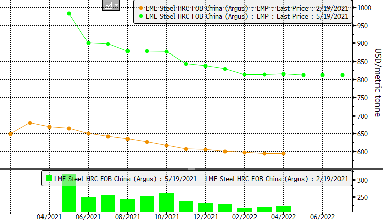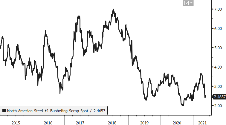 The strengthening in iron ore has been enough for the ratio of busheling scrap over iron ore to return to the same level as the end of 2020, just before busheling scrap increased to its current level.