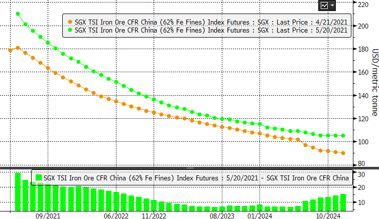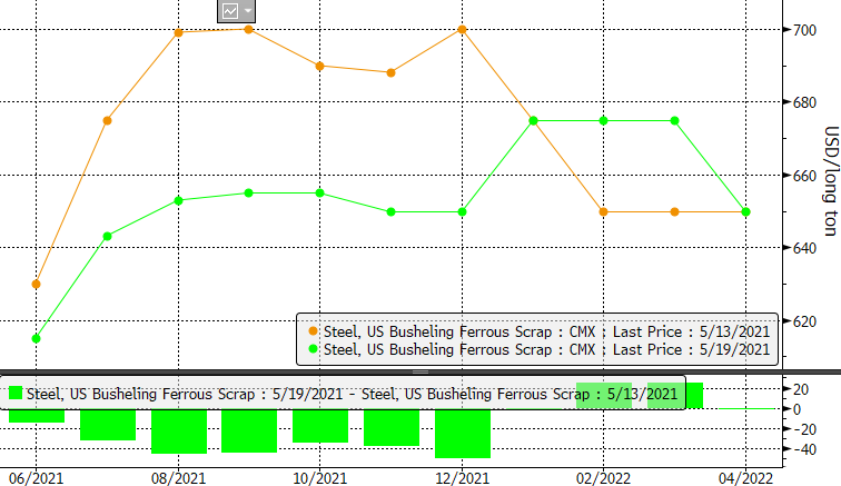 Despite the recent rise in iron ore prices, and perhaps unsurprisingly due to the recent weakness in HRC futures, busheling scrap futures are down $20-40/lt since May 13. This week-over-week weakness, and relative weakness compared to iron ore, is in the face of looming supply expansions at the end of 2021 and early 2022. This new capacity is EAF-based, and thus requires high iron content inputs such as prime scrap. Given that scrap as an input to steelmaking is effectively iron ore plus energy, can the wind fall out of busheling scrap’s sails while iron ore dances around $200/mt?