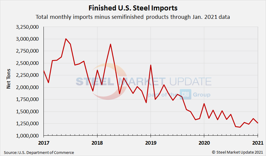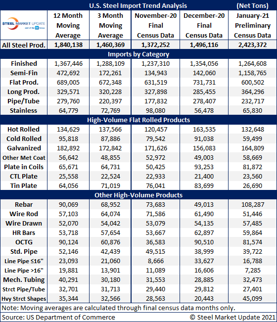 Due to large month-to-month swings in semifinished imports, the chart below shows total monthly imports on a three-month moving average (3MMA) basis in an attempt to more accurately display the U.S. steel import trend. The 3MMA through preliminary January data is now 1.76 million tons, up from 1.46 million tons in December.