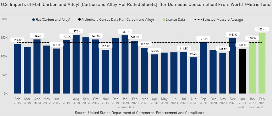 The U.S. is poised to import at least 162,357.3 metric tonnes of hot-rolled coil in February, according to import license data last updated by the Commerce Department on Wednesday, Feb. 24.