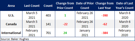 International rigs increased by 24 to 701 rigs for the month of February, a decrease of 384 rigs from the same month one year ago. For a history of both the U.S. and Canadian rig count, visit the Rig Count page on the Steel Market Update website here.