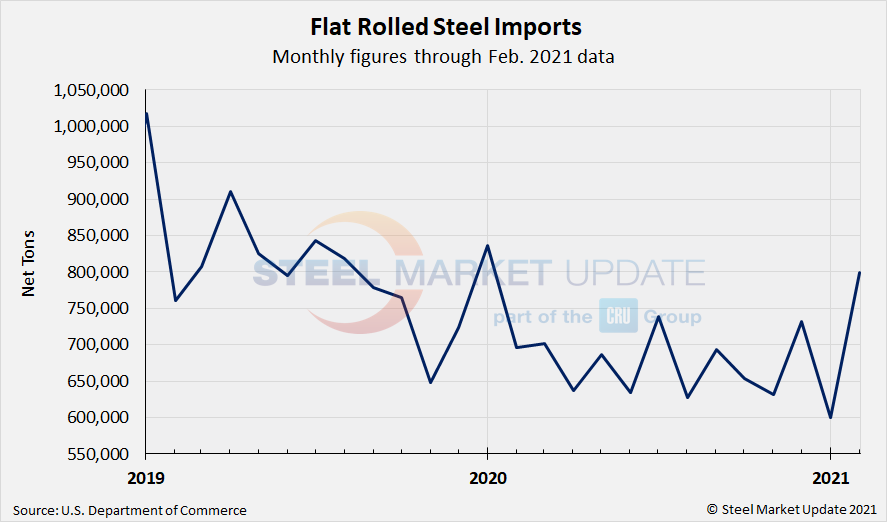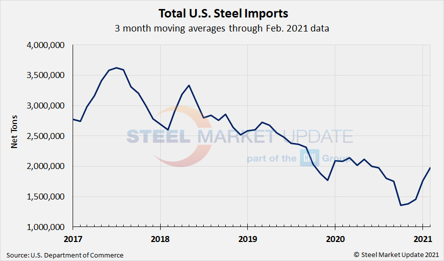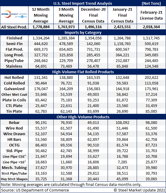Due to large month-to-month swings in semifinished imports, the chart below shows total monthly imports on a three-month moving average (3MMA) basis in an attempt to more accurately display the U.S. steel import trend. The 3MMA through February license data is 1.98 million tons, up from 1.76 million tons in January and up from 1.46 million tons in December. It appears total steel imports are climbing back towards pre-pandemic levels.