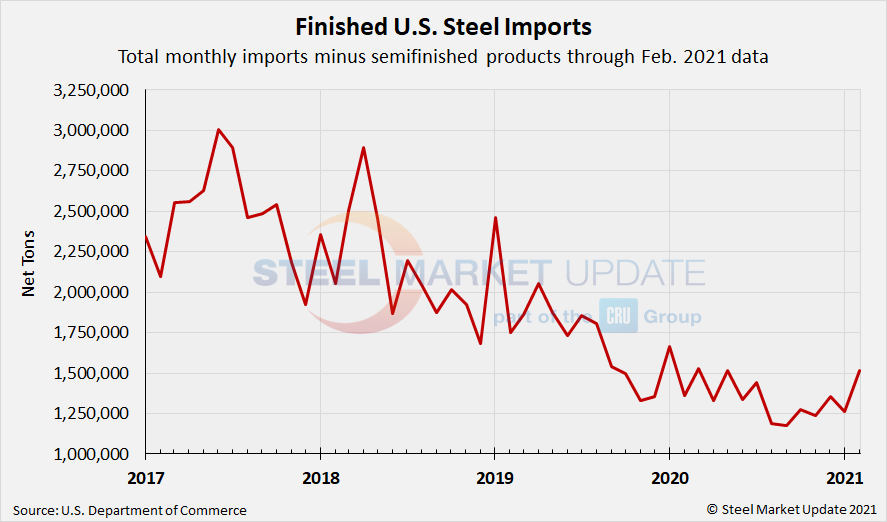 Total finished imports in January were down 7% from the prior month at 1.26 million tons, while February licenses were up to 1.52 million tons. If this upwards February license trend continues, it could be the highest monthly finished steel import level seen since January 2020.