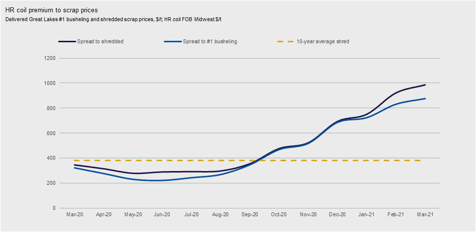 Although scrap prices are higher than they have been in over a decade, they are still being outpaced by steel prices, McKinley noted, creating a large margin for the mills. The chart below from CRU shows the rising spread between scrap and hot rolled coil prices over the past year.