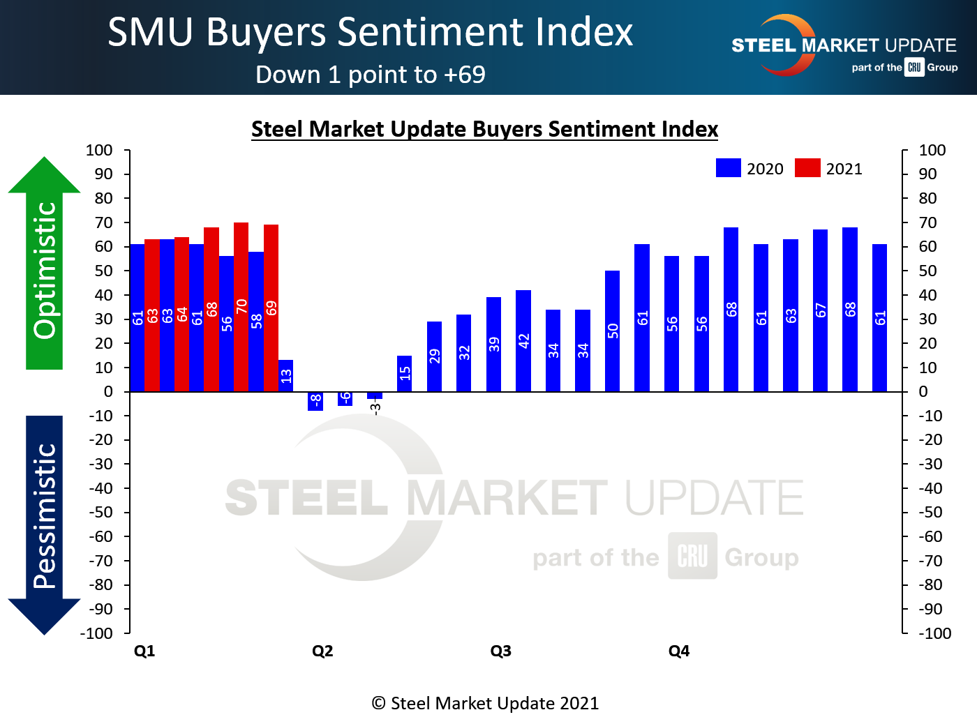 SMU Steel Buyers Sentiment Index is a measurement of the current attitude of buyers and sellers of flat rolled steel products in North America regarding how they feel about their company’s opportunity for success in today’s market. It is a proprietary product developed by Steel Market Update for the North American steel industry.