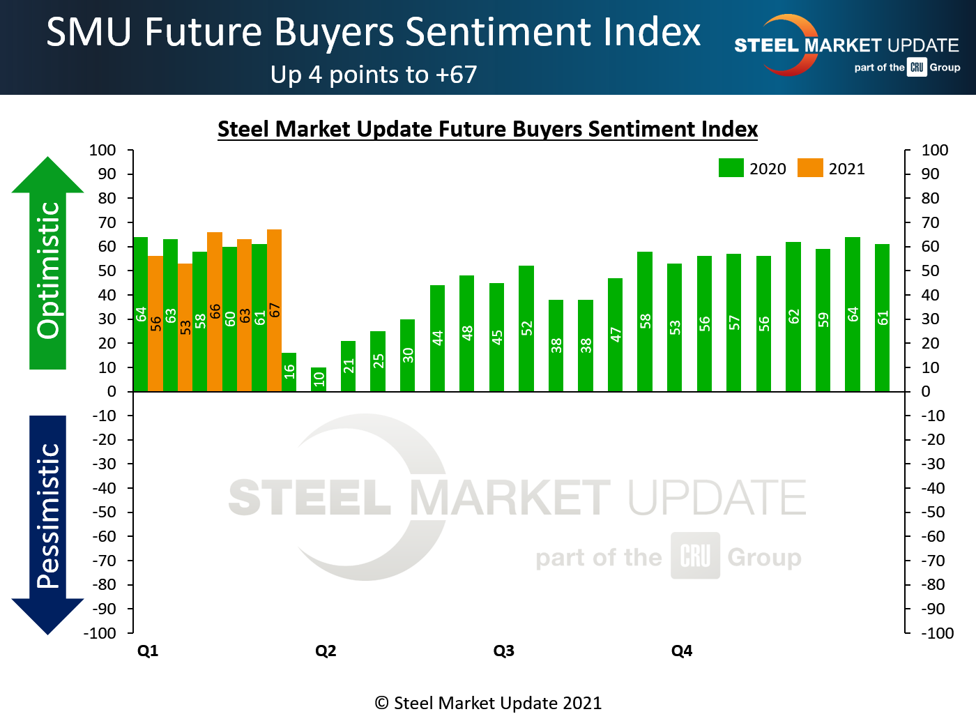 Steel Buyers Sentiment, as measured by Steel Market Update, has seen little change since the beginning of February, recording a very optimistic reading of +69 this week. Future Sentiment moved up four points to a nearly as bullish +67. Both Current and Future Sentiment now exceed pre-pandemic levels and suggest that the market is hopeful about the year ahead.
