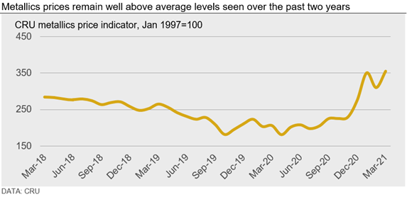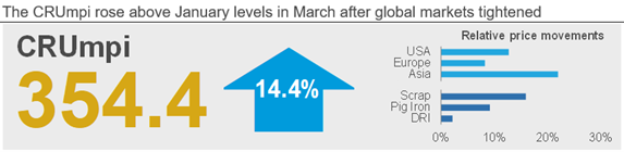 The CRU metallics price indicator (CRUmpi) rose by 14.4% m/m in March to 354.4, bouncing back above levels seen in January. China’s return to the steel market following New Year holiday celebrations there helped lift steel and scrap prices in Asia, while seasonally constrained supply in Europe and the U.S. during a time of high demand also resulted in a rise in metallics prices. We see some downside price risks building for April, but do not expect prices to undergo substantial downside pressure.