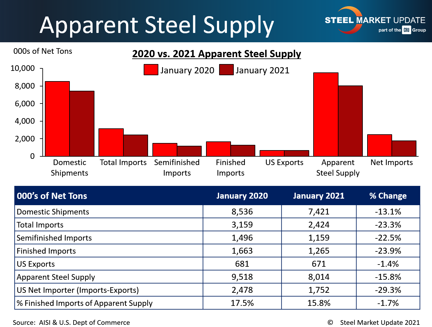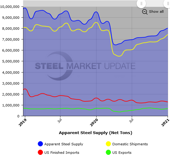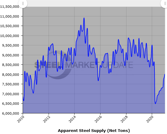 U.S. apparent steel supply rebounded to a 10-month high in January, up 2.9% to 8.01 million net tons, according to the latest U.S. Department of Commerce and American Iron and Steel Institute data. This is the highest level seen since March 2020 when apparent supply was 8.63 million tons. Recall that April and May of 2020 were the two lowest levels seen in the last 10 years at 6.53 million tons and 6.60 million tons, respectively. January supply is down more than 1.5 million tons compared to the same month in 2020.