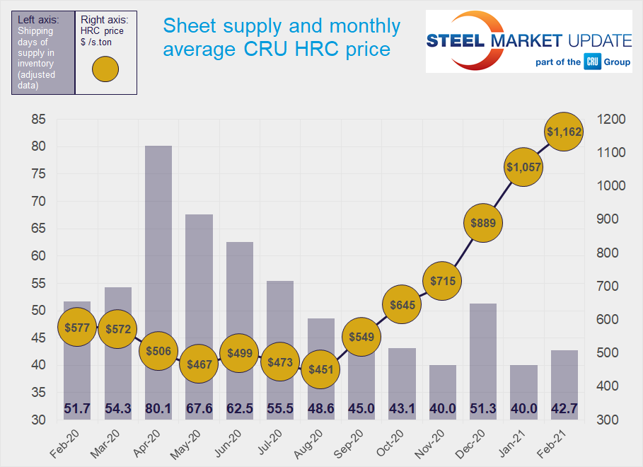 Inventories increased in February with more inbound shipments from domestic mills as well as imports. February import licenses for carbon and alloy flat products totaled 749,000 metric tonnes, which, if all materializes, will be the highest level of imports since January 2020, according to U.S. Department of Commerce data. At the same time, domestic lead times continue to extend. The latest Steel Market Update survey on March 3 reported HRC lead times at 9.03 weeks, up from 7.91 weeks a month before.