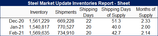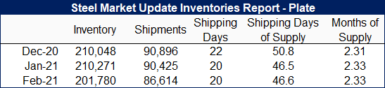 Plate inventories were flat in February with the decrease in shipments. Service centers carried 46.6 shipping days of plate supply at the end of February, compared to 46.5 shipping days in January. February inventories represented 2.33 months of supply, the same as January.