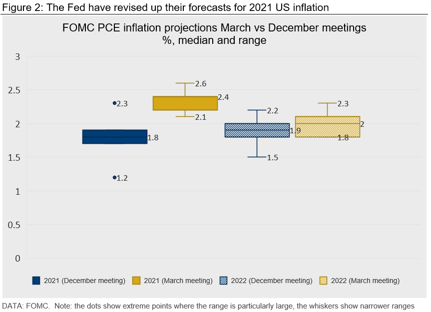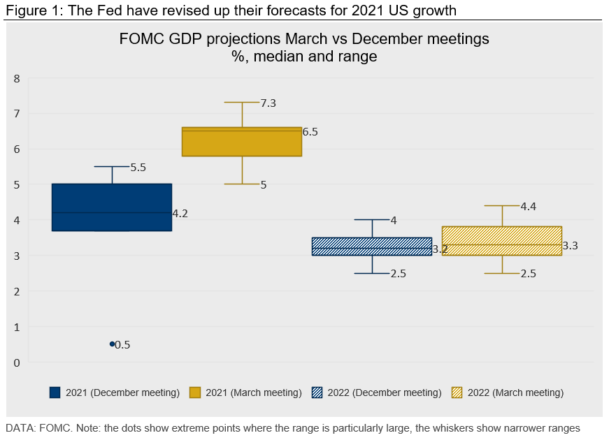 Since the start of January, expectations have been building that 2021 will be a vintage year for U.S. growth. With Biden’s $1.9 trillion stimulus package making it through Congress almost unscathed, and vaccination progressing quickly, economists have been busy marking up their forecasts for U.S. growth. With their latest projections, the Fed has joined the party (Figure 1). They now expect the U.S. economy to grow by 6.5% in 2021 and 3.3% in 2022. This is close to our own forecasts for U.S. growth of 6.5% in 2021 and 3.1% in 2022.