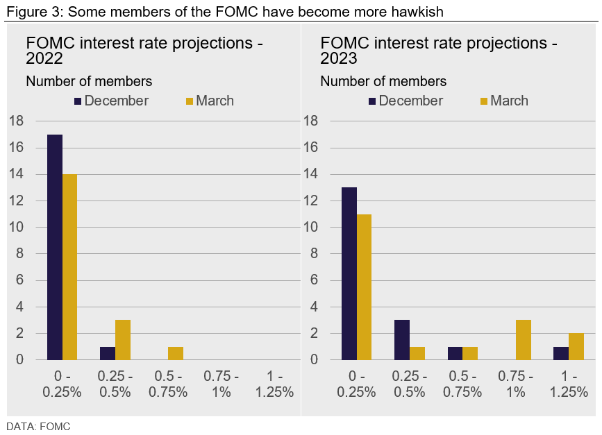 Nonetheless, reflecting the stronger outlook for growth and inflation, some members of the FOMC brought forward their expectation of when the Fed Funds Rate will begin increasing (Figure 3). However, an absolute majority still expect no increase before 2024, and Powell played down the significance of the change.