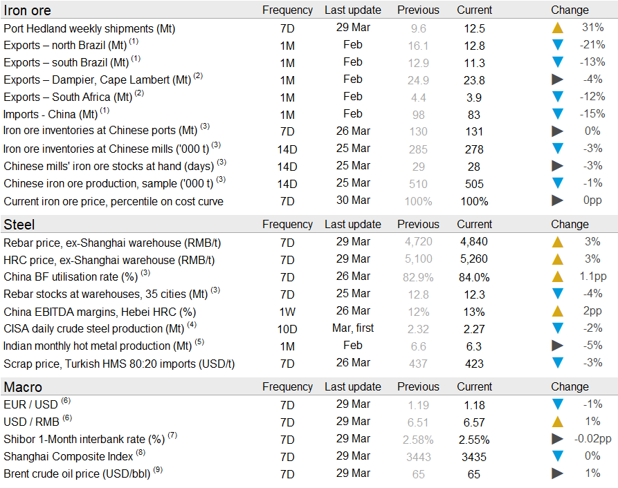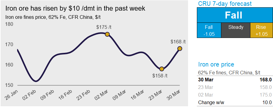 Iron ore prices have risen by $10 /dmt in the past week as Tangshan cuts have raised steel margins and steelmakers in other regions are seeing an uplift in production. On Tuesday, March 30, the 62% Fe fines price was assessed at $168 /dmt.