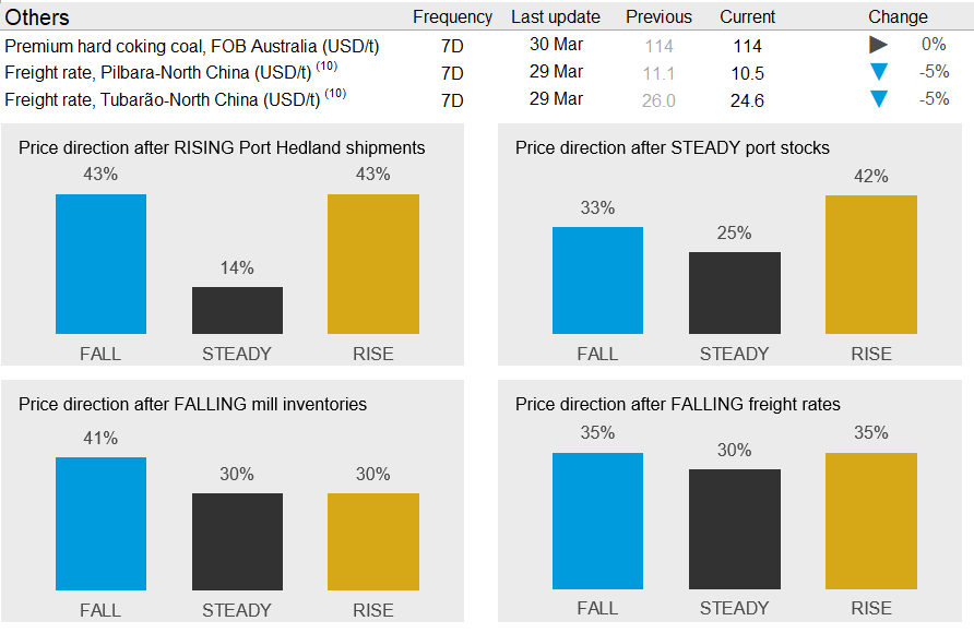 In the coming week, we expect the strong supply to weigh on prices and we expect further price falls. Our indicators below are mixed, but we see further price increases as unlikely considering the robust supply and improving inventory levels in China.