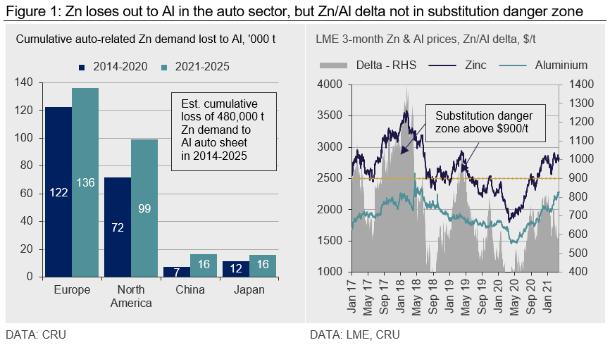For now, while zinc has been trading close to the substitution danger zone in pure price terms, the strength of aluminum’s recent rally means that it is not in danger in terms of price-induced substitution for aluminum in particular. But should zinc’s price breach $3,000 /t, there potentially will be danger from other, more cost-effective materials.