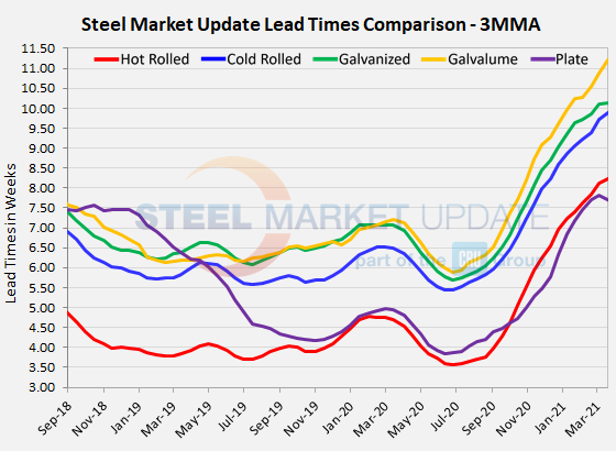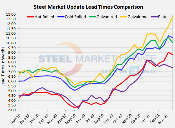 Lead times for spot orders of most steel products appear to have leveled off a bit in the past two weeks, based on Steel Market Update’s latest check of the market. All flat rolled and plate products registered small declines except for Galvalume, which was the only one to see an increase in delivery times since the first week of March.