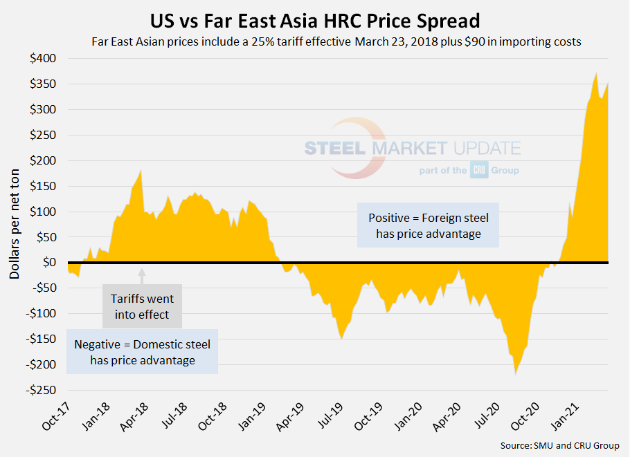 As of Wednesday, March 17, the CRU Far East Asian HRC price increased $14 over the previous week to $685 per net ton ($755 per metric ton), up $23 per ton over two weeks prior. Adding tariffs and import costs, the delivered price of Far East Asian HRC to the U.S. is $946 per ton. The latest SMU hot rolled price average is $1,300 per ton, up $30 over last week and up $60 from two weeks prior. Therefore, U.S.-produced HRC theoretically is now $354 per ton more expensive than imported Far East Asian HRC, up from $341 last week and up from $322 two weeks ago.