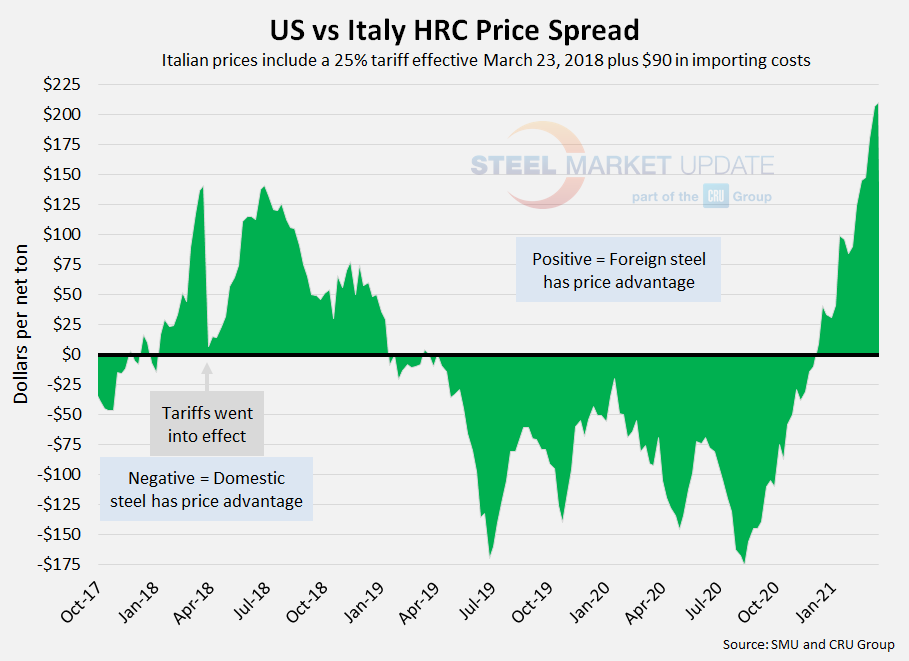 CRU published Italian HRC prices at $800 per net ton ($882 per metric ton), up $22 from last week, and up $24 from two weeks ago. After adding tariffs and import costs, the delivered price of Italian HRC is approximately $1,090 per ton. Accordingly, domestic HRC is theoretically $210 per ton more expensive than imported Italian HRC, up from $207 last week and up from $180 two weeks ago.