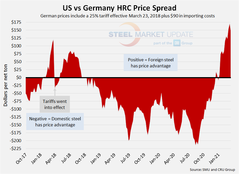 The latest CRU German HRC price is $849 per net ton ($935 per metric ton), up $42 from the previous week and up $51 from two weeks prior. Adding tariffs and import costs, that puts the German price at $1,151 per ton delivered to the U.S. Therefore, domestically sourced HRC is theoretically $149 per ton more expensive than imported German HRC, down from $172 last week and down from $154 two weeks ago.