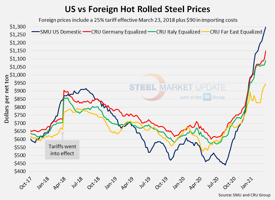 The temptation to purchase hot rolled steel imports over steel produced domestically continues to grow, as more U.S. buyers place orders for foreign material despite long lead times for delivery. As domestic prices soar higher, foreign prices hold potential discounts of 11% to 27%, according to Steel Market Update’s latest foreign versus domestic hot rolled steel price comparison. Foreign HRC prices are theoretically $149-$354 per ton cheaper than domestic steel prices at this time.