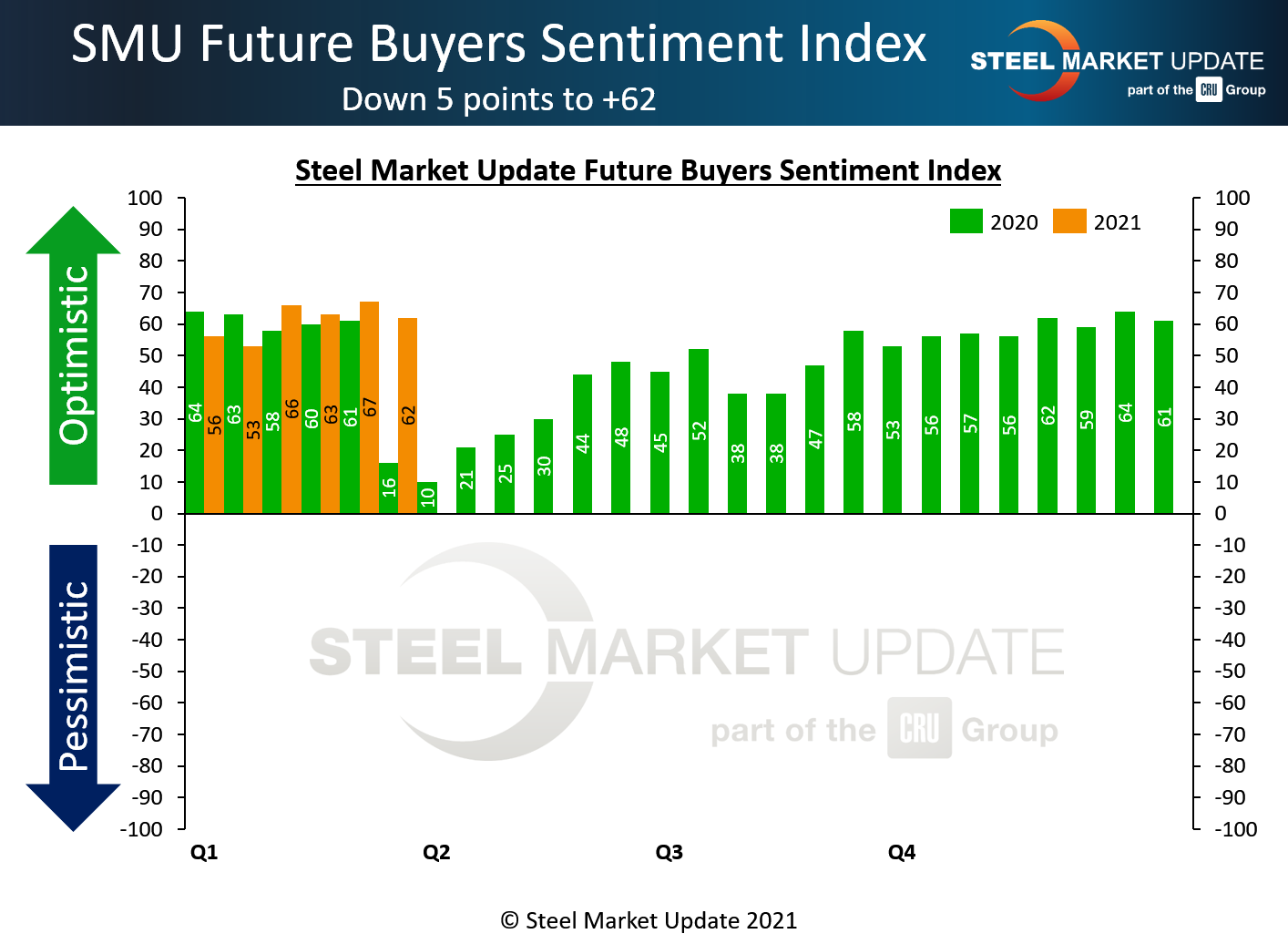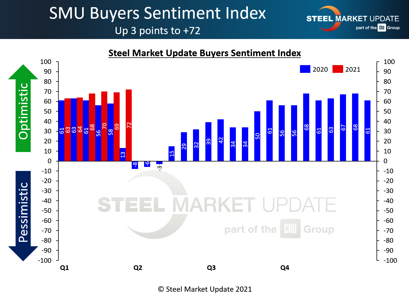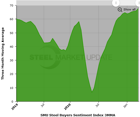 SMU Steel Buyers Sentiment Index is a measurement of the current attitude of buyers and sellers of flat rolled steel products in North America regarding how they feel about their company’s opportunity for success in today’s market. It is a proprietary product developed by Steel Market Update for the North American steel industry.