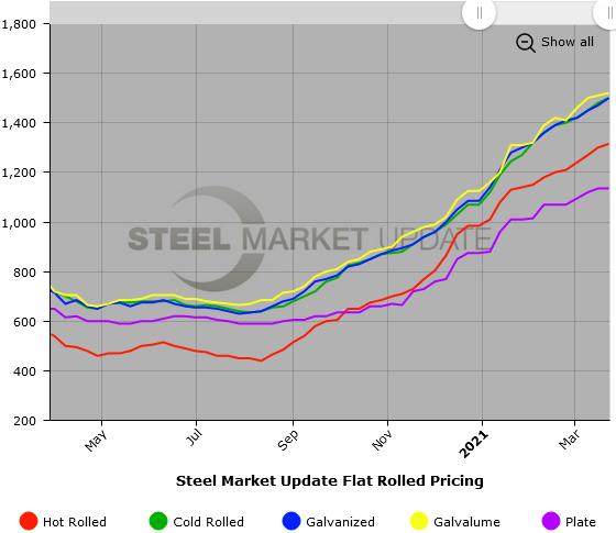 SMU Note: Below is a graphic showing our hot rolled, cold rolled, galvanized, Galvalume and plate price history. This data is available here on our website with our interactive pricing tool. If you need help navigating the website or need to know your login information, contact us at info@SteelMarketUpdate.com.
