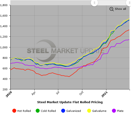 SMU Note: Below is a graphic showing our hot rolled, cold rolled, galvanized, Galvalume and plate price history. This data is available here on our website with our interactive pricing tool. If you need help navigating the website or need to know your login information, contact us at info@SteelMarketUpdate.com.