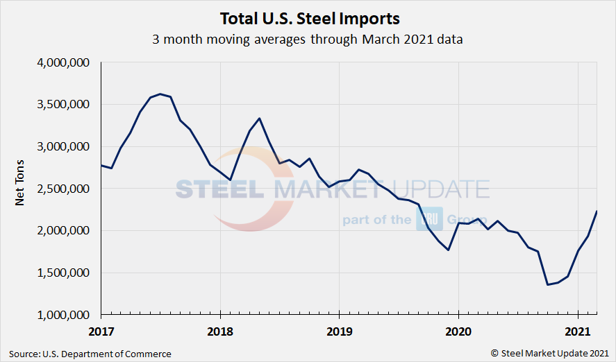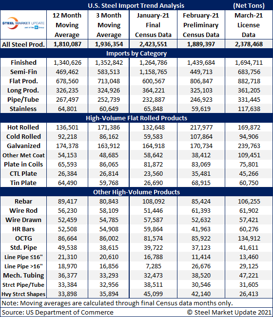 Due to large month-to-month swings in semifinished imports, the chart below shows total monthly imports on a three-month moving average (3MMA) basis in an attempt to more accurately display the U.S. steel import trend. The 3MMA through March license data is 2.23 million tons, up from 1.94 million tons in February and up from 1.76 million tons in January. The March 3MMA is the higest seen since September 2019.