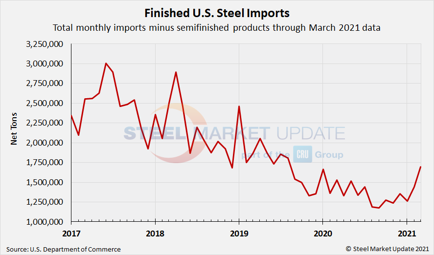 March import licenses are currently at 2.38 million tons as of data through March 30, up 26% from February, but down 2% from January. Recall that the average monthly import level for 2020 was 1.84 million tons, down from 2.32 million tons in 2019 and 2.81 million tons in 2018. Preliminary March finished steel imports are at 1.69 million tons, up 18% over February and up 34% over January. March finished-steel imports could potentially reach a 19-month high.