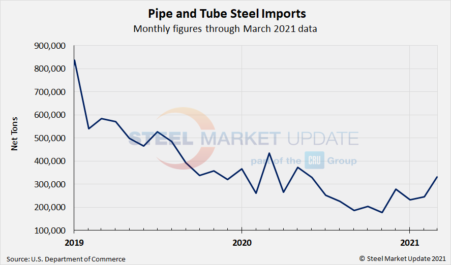 The two charts below show monthly imports grouped by product category: flat rolled imports and pipe and tube imports. Both product groups showed gains in February and March, with flat rolled imports rebounding from January’s multi-year low and approaching levels last seen nearly two years. March data suggests a 34% spike in pipe and tube products over February, up 42% from the January low and back in line with pre-pandemic levels.