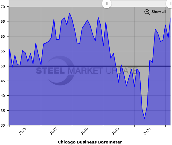 Below is a graph showing the history of the Chicago Business Barometer. You will need to view the graph on our website to use its interactive features; you can do so by clicking here. If you need assistance logging in to or navigating the website, please contact us at info@SteelMarketUpdate.com.