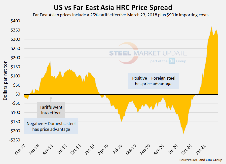 As of Wednesday, March 31, the CRU Far East Asian HRC price increased $36 over the previous week to $744 per net ton ($820 per metric ton), up $59 per ton over two weeks prior. Adding tariffs and import costs, the delivered price of Far East Asian HRC to the U.S. is $1,020 per ton. The latest SMU hot rolled price average is $1,330 per ton, up $15 over last week and up $30 from two weeks prior. Therefore, U.S.-produced HRC theoretically is now $310 per ton more expensive than imported Far East Asian HRC, down from $341 last week and down from $354 two weeks ago.