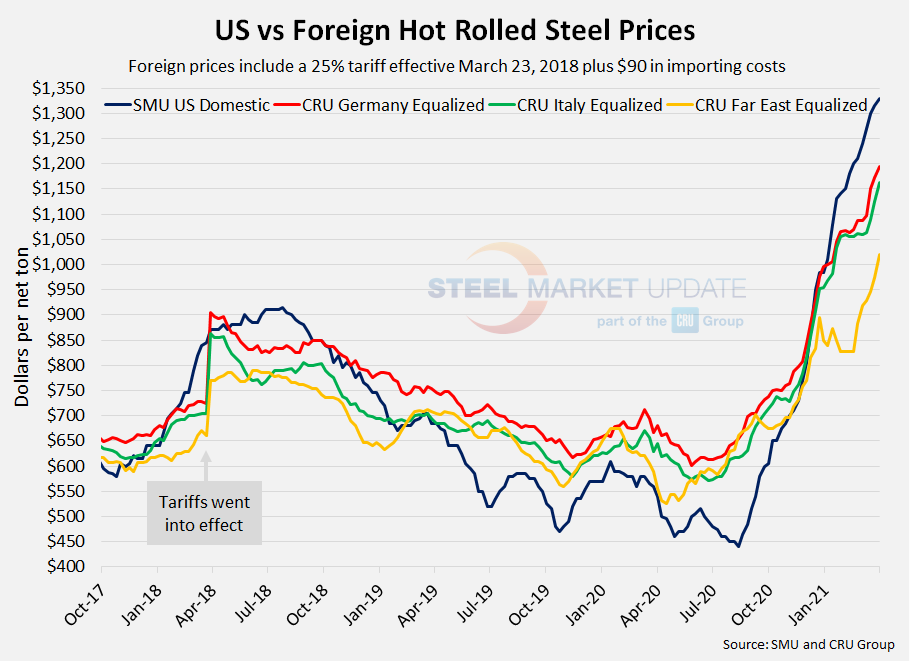 The temptation to purchase foreign hot rolled over domestic steel remains high, as more U.S. buyers place orders for foreign material despite long lead times for delivery. Since mid-March, foreign steel prices have begun to increase at a greater rate compared to domestic prices, yet foreign prices still hold potential discounts of 10-24%, according to Steel Market Update’s latest foreign versus domestic hot rolled steel price comparison.