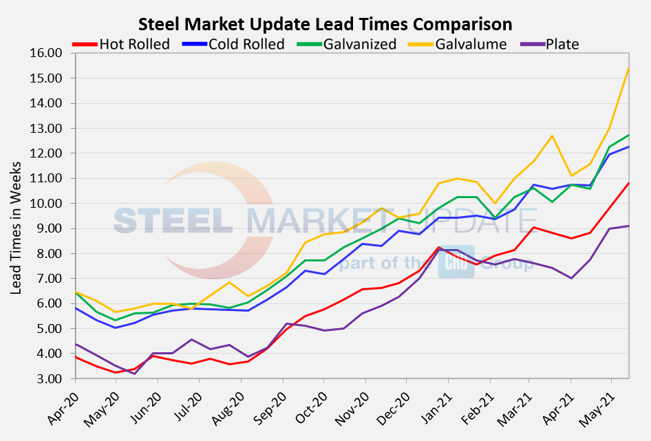 It’s hard to believe that lead times could get much longer, but that appears to be the case. Steel Market Update’s latest survey data shows that flat rolled delivery times have stretched by an additional one to two weeks over the past month.