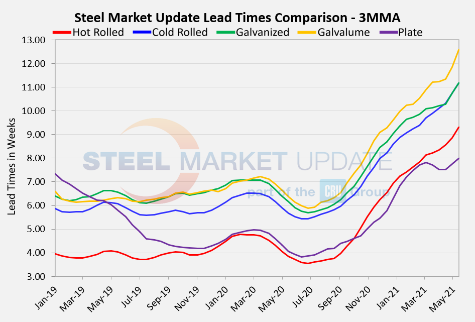 Lead times have been extending since last June, based on three-month moving averages which smooth out the weekly volatility. The 3MMA for hot rolled lead times now averages 9.31 weeks, cold rolled 11.16 weeks, galvanized 11.16 weeks, and Galvalume 12.58 weeks, while plate’s 3MMA is up to 7.98 weeks. Thus, lead times at roughly twice the historical averages have been the norm for an extended period and show no signs of reversing. Which suggests that steel prices may have more room to rise.