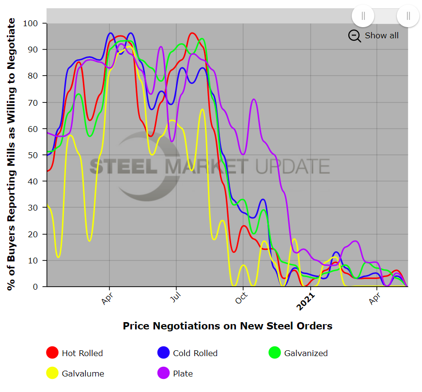 None of the respondents to this week’s survey reported any mills willing to negotiate on steel prices. Given the current high-demand, low-supply environment, the mills have all the leverage in price talks.