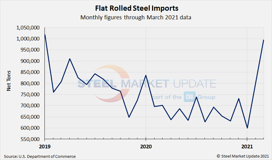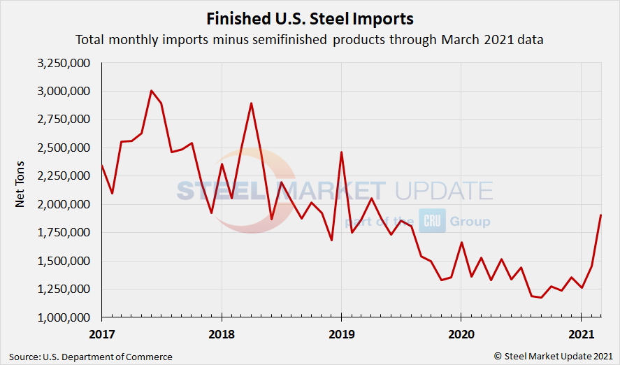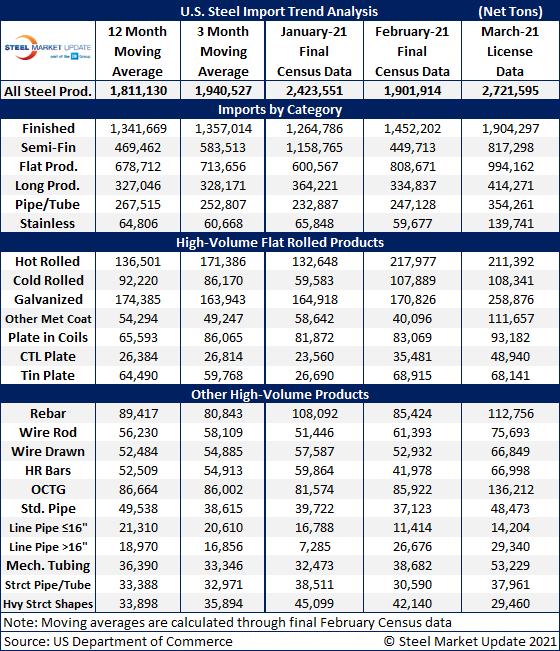 Due to large month-to-month swings in semifinished imports, the chart below shows total monthly imports on a three-month moving average (3MMA) basis in an attempt to more accurately display the U.S. steel import trend. The 3MMA through March license data is 2.35 million tons, up from 1.94 million tons in February and up from 1.76 million tons in January. The March 3MMA is now the higest seen since August 2019.