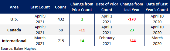 International rigs increased by 14 to 715 rigs for the month of March, a decrease of 344 rigs from the same month one year ago. For a history of both the U.S. and Canadian rig count, visit the Rig Count page on the Steel Market Update website here.