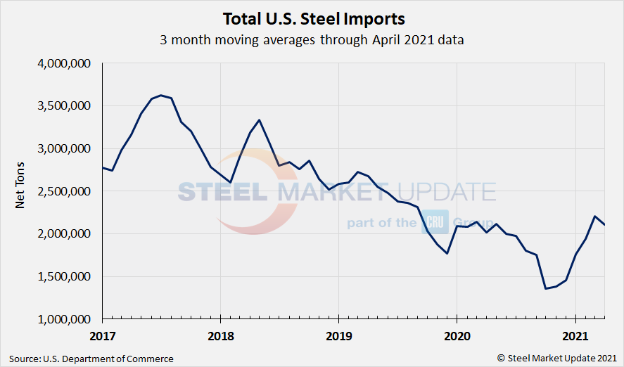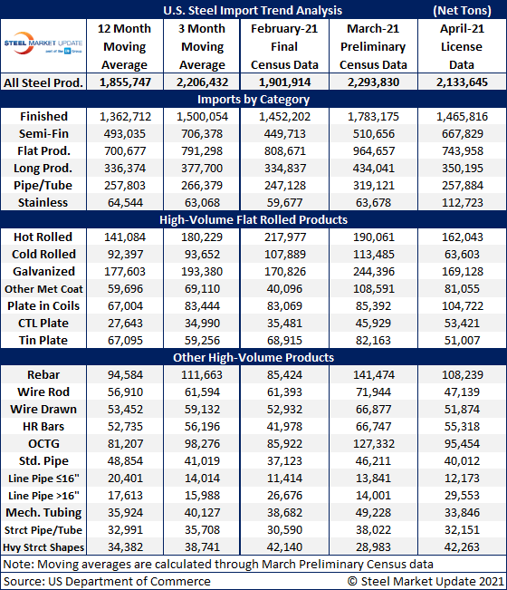 Due to large month-to-month swings in semifinished imports, the chart below shows total monthly imports on a three-month moving average (3MMA) basis in an attempt to more accurately display the U.S. steel import trend. The 3MMA through preliminary March import data is 2.21 million tons, up from 1.94 million tons in February and up from 1.76 million tons in January. The March 3MMA is now the highest seen since September 2019.