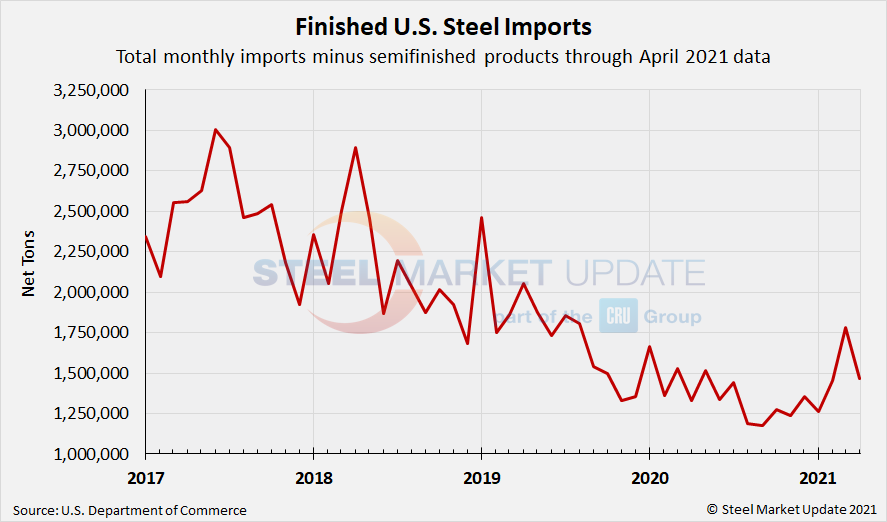 Final Census data shows that finished steel imports rose 23% in March to 1.78 million tons, as more U.S. buyers sought relief from climbing domestic prices and limited supplies. This is the highest finished-steel import level seen since August 2019 when finished imports were 1.80 million tons.