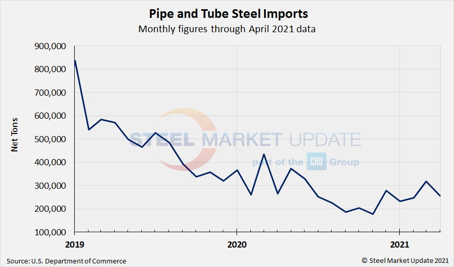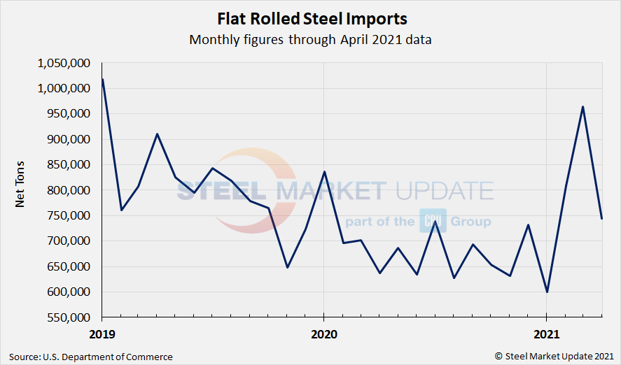 Total steel imports were 2.29 million tons in March, up 21% month-over-month. Total April import licenses are currently at 2.13 million tons as of Census data through April 26, down 7% from March, but up 12% from February. For comparison, the average monthly import level for 2020 was 1.84 million tons, down from 2.32 million tons in 2019 and 2.81 million tons in 2018.